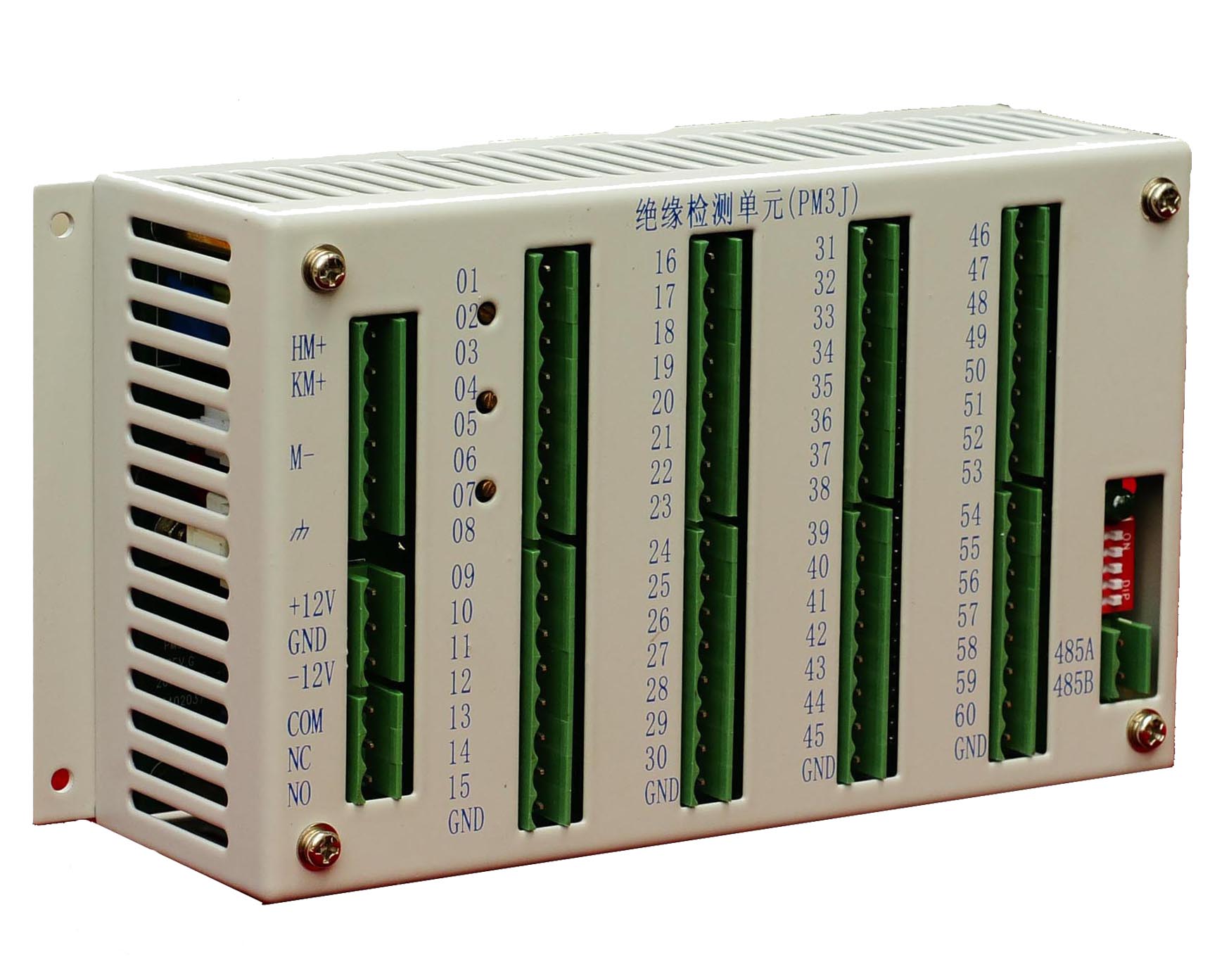 PM3J根据由PM4S,K3B10L等组成的系统合母路数正确设置SW1的前2位拨码位置,但PM3J绝缘检测单元上处理支路传感器信号接线时,必需预留相应的合母设置数,而不是系统中实际合母数。例如:当系统中合母回路为7路时,应将PM3J上第一个拨码设为ON,第二个拨码设为OFF,即选择1-10路为合母监测。那么合母01-07路支路传感器输入信号应接在印有“01路”-“07路”字样的接点上,控母支路传感器输入信号应从印有“11路”字样的接点开始依次接入,其中PM3J上的08-10路既为预留合母设置数。